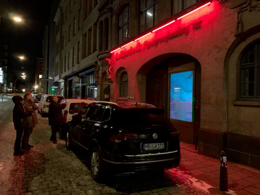 The video, »A Swimming Symphony«, was projected from inside Westwerk's closed-down hall (where the ensemble had recorded back in November 2018) onto the window installed in the buiilding's entrance gate. Hidden speakers in the gate's arch broadcast the soundtrack onto the snow-covered street. Passers-by out walking between early evening and late at night were surprised by this sudden warm ambush of music and images of giant fish converging with shots of the musicians performing "under water".