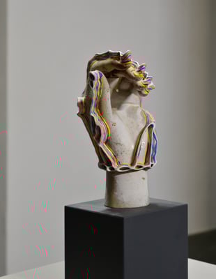 Making use of the large window installed in its entrance gate, Westwerk started a series of solo shows which could be viewed from the street. The window series was called CORONAVISION and when I secured a ten-day slot in the schedule in April 2020 I selected a single photograph I'd taken in Tate Britain on my last trip to the UK just before Covid changed our lives. Not only was it now impossible to experience what the young woman can be seen doing in the picture, but it was also a classic motif of an image within an image within an image. The bust on the plinth at the centre of my shot prompted me to ask my friend Swen Kaehlert, a very talented and versatile artist, to lend me his sculpture of a hand whose delicately beautiful membrane of disease seemed to perfectly echo the bust in the photograph.